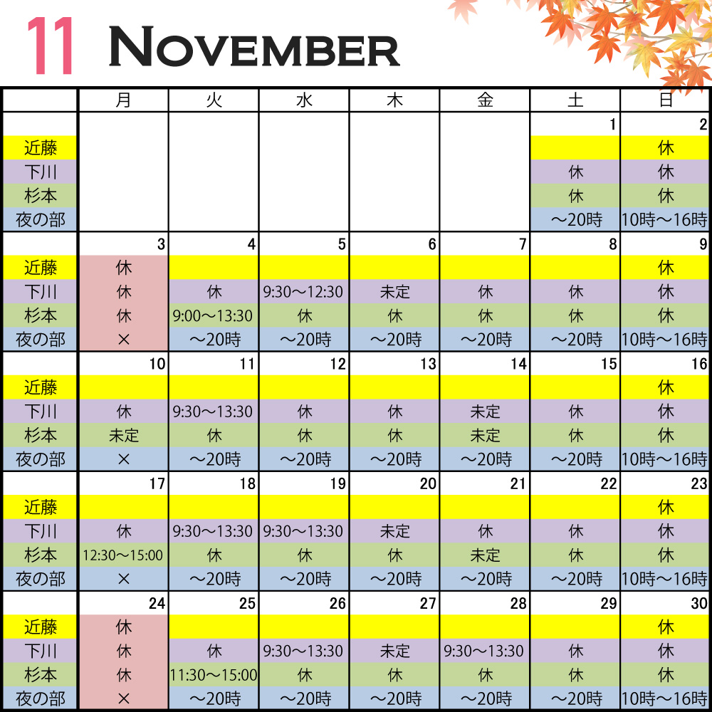 11月のスケジュールとスタッフのシフトをお知らせします。